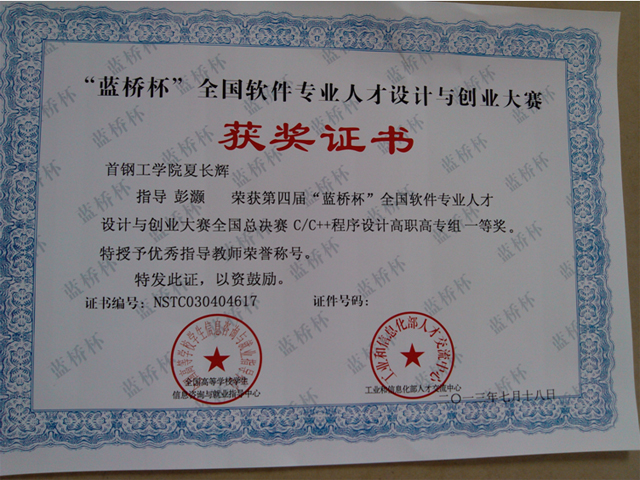 全部獲獎,分別是一等獎1項,二等獎2項,三等獎1項,優秀獎2項。計應121班的彭灝同學獲得北京賽區一等獎,進入全國決賽。在老師的精心指導下,決賽中彭灝同學不畏強手,沉著應戰,憑借高水平穩定發揮,一舉榮獲全國總決賽C/C++程序設計高職高專組一等獎,并創造了北京市所有參賽高職院校的最好成績,夏長輝老師被組委會評為優秀指導教師。他們以優異的成績,展示了我院在軟件專業領域的教學水平和教育成果,為學院贏得了榮譽。