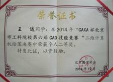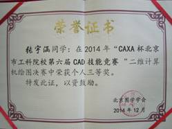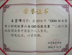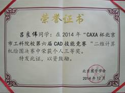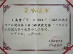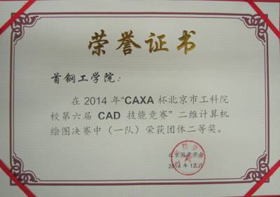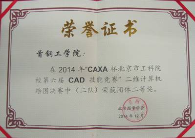 2014年11月1日由北京圖學學會和北京數碼大方科技有限公司(CAXA)組織舉辦了CAXA杯北京市工科院校第六屆CAD技能競賽,該競賽旨在提高學生計算機繪圖技能,加強學生動手能力的培養和工程實踐的訓練,吸引、鼓勵廣大學生踴躍參加課外科技活動,給學生提供一個展示才華的平臺,為優秀人才脫穎而出創造條件。為了促進和加強實踐教學環節,將課程教學與技能競賽相結合,提高教育和教學質量,也為了給學生提供實踐鍛煉和展示才能的平臺,我院機電系機設教研室安排教師張曉春和張靜組織學生參加了此次競賽的二維計算機繪圖競賽,經過精心篩選及賽前訓練,首次參加此類競賽就一舉取得了兩個團體二等獎、3個個人二等獎和4個個人三等獎以及優秀指導師獎的喜人成績,充分體現了我院的教學水平和實踐能力,體現了良好的教學效果,為首鋼工學院贏得了榮譽。