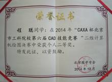 本次參賽對象為全市各級各類工科院校(包括本科院校、職業院校、中專和技校)的在校學生,以學校為單位組隊參加,高職和中職分組競賽分別評分,每隊最多6人(其中選手5人、指導教師1人),每校限報兩隊。為了擴大學生參與面,增加競賽氛圍,接到報名通知后,指導教師張曉春和張靜組織本系機設131班和中德制圖121班的學生于2014年9月24日進行了系內選拔賽,從參賽的32名學生中擇優選拔了10名學生組成每隊5人的2個隊,二位指導教師分別帶領一個隊參加北京市比賽。賽前利用一個月的業余時間進行了針對性訓練,在指導教師的精心組織和悉心指導下,隊員們勤奮努力,進行了大量的課題練習,為參加競賽做好了準備。2014年11月1日,由教師張曉春和張靜帶隊,赴北航參加競賽,此次競賽高職組共有9所院校的18個代表隊參賽,我院參賽隊員在比賽中拼搏努力,最終取得了喜人的成績,參賽10人中有3人榮獲北京市個人二等獎,4人榮獲個人三等獎,獲獎率高達70%,同時兩個隊均榮獲團體二等獎,為首鋼工學院爭得了榮譽,增強了學生的自信心,也提高了教師搞好教學和比賽信心和動力,為以后參加此類大賽包括課程改革奠定了基礎,積累了寶貴的經驗。