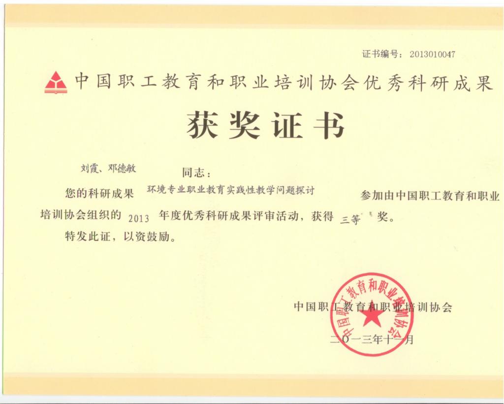 ? 建工系劉霞、鄧德敏老師的兩篇論文參加中國職教協會優秀科研成果評選均獲獎。其中,劉霞、鄧德敏老師的《環境專業職業教育實踐性教學問題探討》獲得三等獎,鄧德敏老師的《高職環境工程專業有機化學教學改革研究》獲得優秀獎。