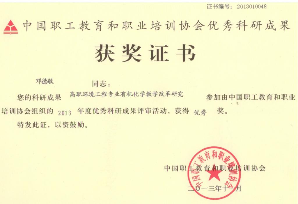 ? 建工系劉霞、鄧德敏老師的兩篇論文參加中國職教協會優秀科研成果評選均獲獎。其中,劉霞、鄧德敏老師的《環境專業職業教育實踐性教學問題探討》獲得三等獎,鄧德敏老師的《高職環境工程專業有機化學教學改革研究》獲得優秀獎。 證?? 書