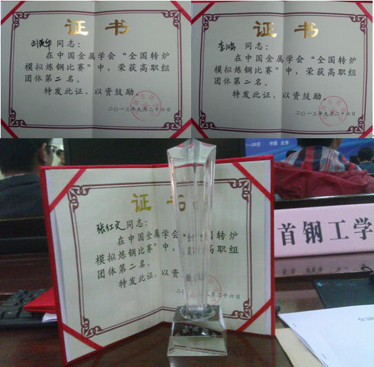 ??? 全國轉爐模擬煉鋼大賽于2013年9月23日至26日在北京科技大學生舉行,分高職組、企業組、本科組三個級別。建工系冶金技術專業張紅文老師帶領冶金111班李鴻、劉英華兩位同學參加了高職組的比賽,最終脫穎而出獲得高職組第二名的好成績。