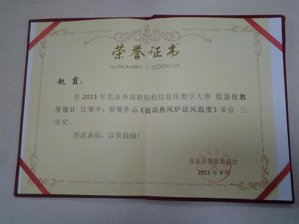 ? ? ????? 建工系教師趙霞,參加了北京市教育委員會(huì)主辦,北京工業(yè)職業(yè)技術(shù)學(xué)院承辦的“2013年北京市高等職業(yè)院校信息化教學(xué)大賽”。在院、系各級(jí)領(lǐng)導(dǎo)的大力支持,以及教務(wù)處的合力幫助下,經(jīng)過(guò)精心準(zhǔn)備,完成了參賽作品—《提高熱風(fēng)爐送風(fēng)溫度》的制作,該作品整體思路清晰,結(jié)構(gòu)層次分明,ppt課件制作精良,課程講解條理清晰,體現(xiàn)了較高的業(yè)務(wù)素養(yǎng)和專業(yè)水平,得到了大賽專家和評(píng)委的認(rèn)可,并獲得了大賽的三等獎(jiǎng)。 ?