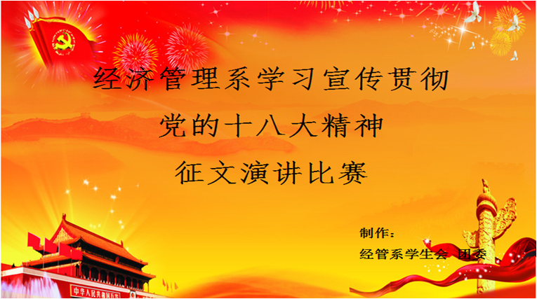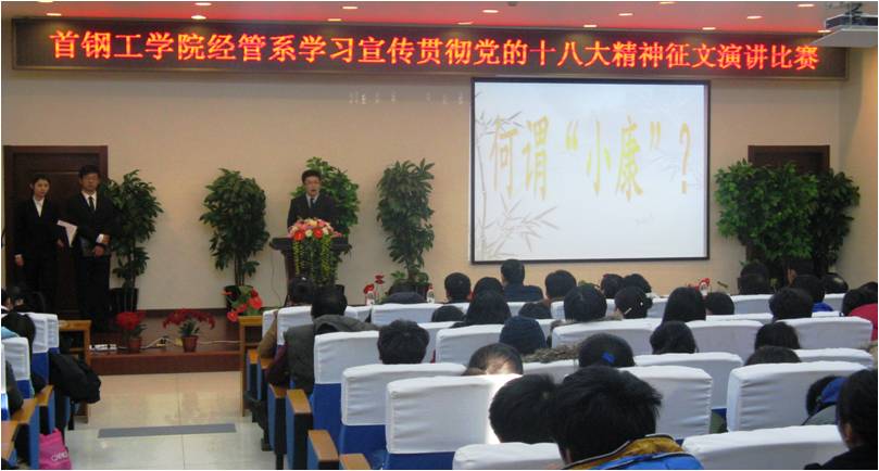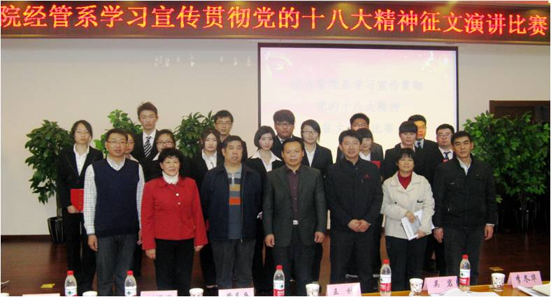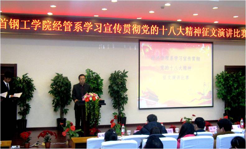 在全國上下掀起學習貫徹落實黨的十八大精神熱潮之際,為深入學習宣傳貫徹黨的十八大精神,培養大學生高度的政治責任感和使命感,激勵學生積極向上、刻苦學習、勇于實踐,自覺擔負起新時期黨和人民賦予的歷史使命,以更加積極向上的精神去學習和工作,經管系于2012年12月5日下午在首鋼工學院第二報告廳召開了“學習宣傳貫徹十八大精神征文演講比賽”。