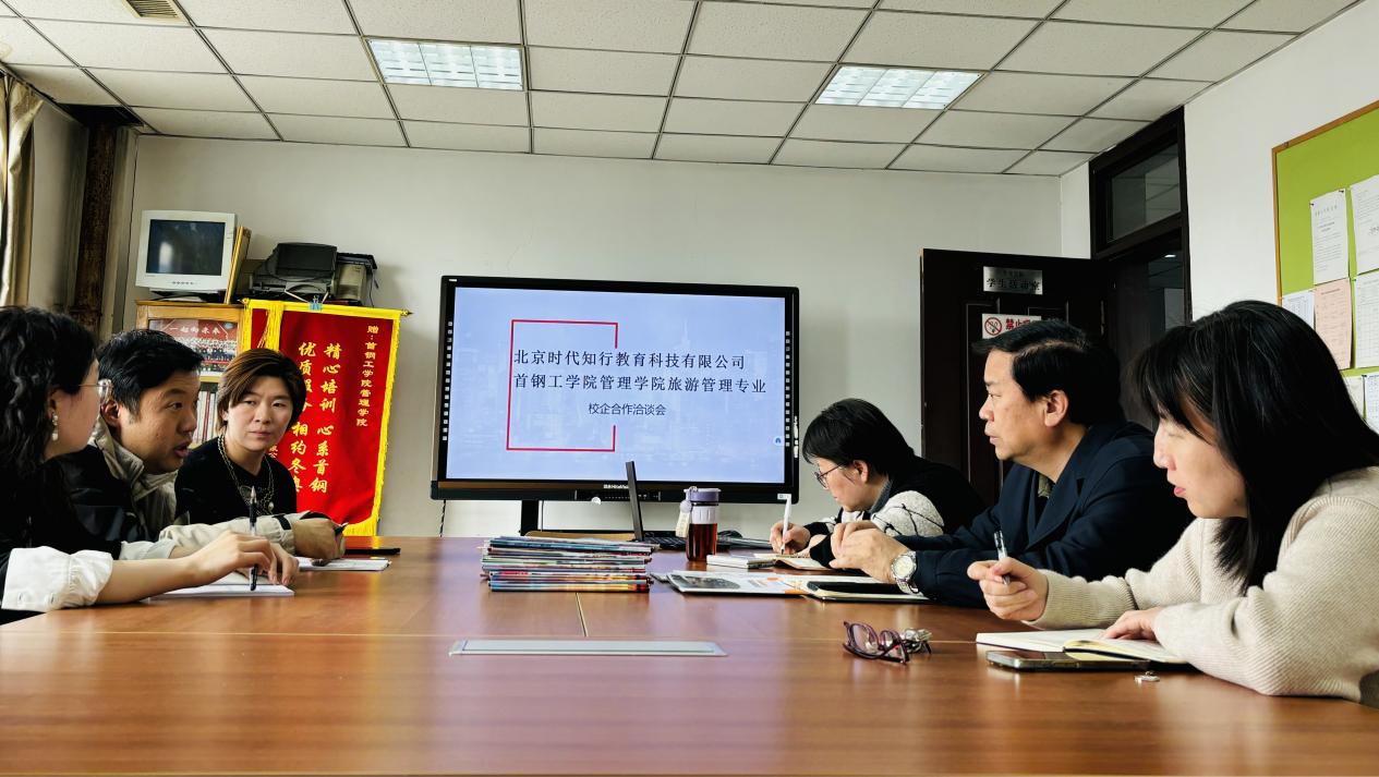 座談中北京時代知行教育有限公司產(chǎn)品總監(jiān)韓樹表達(dá)了企業(yè)需求,希望在首鋼園主題定制產(chǎn)品開發(fā)、首鋼工學(xué)院研學(xué)產(chǎn)品開發(fā)、企業(yè)訂單班、寒暑假學(xué)生實踐等方面和學(xué)校進(jìn)行深度的合作。張衛(wèi)國院長詳細(xì)介紹了實訓(xùn)基地、住宿設(shè)施、實訓(xùn)大廳、后勤服務(wù)等資源,雙方在校企合作、項目經(jīng)營、人才培養(yǎng)、學(xué)生實習(xí)就業(yè)等方面具有高度互補性,可以進(jìn)行深度合作。教學(xué)院長王佳表示在訂單班開設(shè)、學(xué)生實習(xí)就業(yè)等方面可以進(jìn)一步合作。專業(yè)負(fù)責(zé)人楊靜老師補充介紹了首鋼園主題定制產(chǎn)品研學(xué)課程與研學(xué)課程開發(fā)校企合作方向,重點闡述校企雙方如何進(jìn)行優(yōu)勢互補,深度參與時代知行研學(xué)課程開發(fā),闡明旅游管理專業(yè)人才培養(yǎng)和學(xué)生就業(yè)需求,聚集學(xué)生研學(xué)實踐,探索提質(zhì)培優(yōu)新途徑。