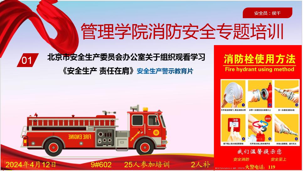 管理學院高度重視安全教育工作,由兼職安全員侯千老師制定了專題培訓方案。確定了“安全生產責任在肩”安全專題培訓的安全教育主題;明確了安全生產必須警鐘長鳴、常抓不懈的指導思想。培訓開始后全體教師首先觀看了北京市安全生產委員會辦公室京安辦通[2024]23號北京市安全生產委員會辦公室《安全生產責任在肩》安全生產警示教育片 (以下簡稱警示片)。張衛國院長結合管理學院實際,要求重點做好如下工作:一是要求教職工在認真觀看學習本視頻教材的基礎上進一步教育引導學生切實承擔起安全生產監管責任,壓減安全生產事故,促進全校消防安全工作持續穩定開展。二是落實學校保密規定。警示片學習僅限內部使用,嚴禁在微信微博等網上傳播。三是沉淀學習培訓成果,將培訓收獲進一步轉化為教職工實際應用的技能,能夠在具體工作中熟練運用。
