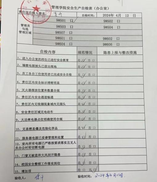 管理學院針對消防安全、食品安全、實驗室安全、安全生產、管理、校園交通安全、校園治安、實習實訓安全、極端天氣防范應對工作、安全隱患排查整治情況、應急管理和突發事件處置等方面的安全管理和逐級主體責任和全員責任制落實情況,組織人員持續開展自檢自查。