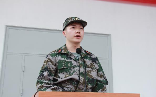 管理學院旅游 241 楊碩同學作為學生代表進行發言,他以洪亮的聲音表達了全體同學通過軍訓更能磨練自己的意志,培養堅韌不拔的品質并表達了不畏風雨、積極參訓的決心。