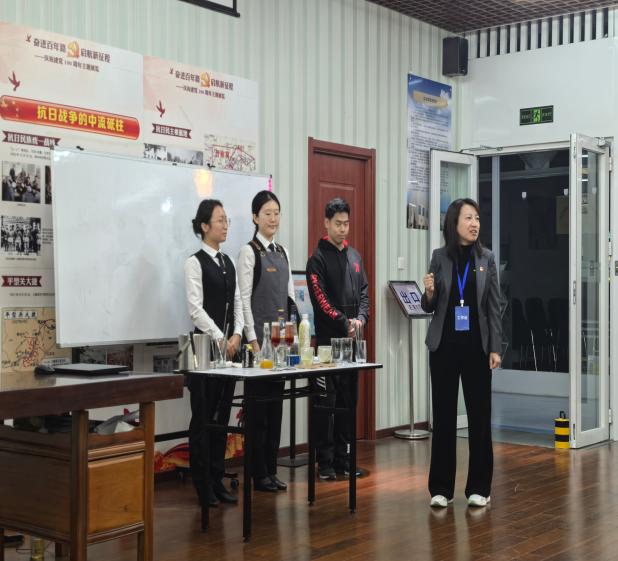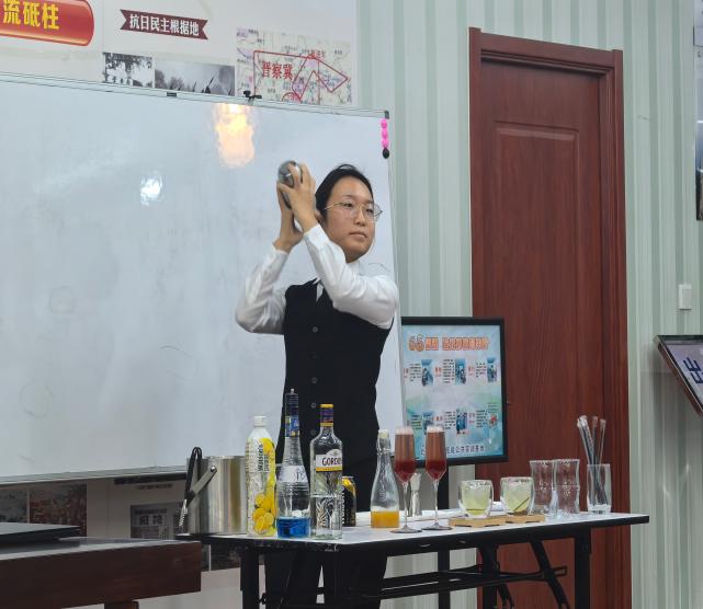 然后由旅游專業(yè)負責人楊靜老師講解了旅游專業(yè)的特色及備賽情況,緊接著由22級參加全國技能大賽酒水服務賽事的同學進行了現(xiàn)場調(diào)酒展示,她身著整齊的制服,手持調(diào)酒器具,熟練地搖晃、攪拌,全程用英文進行介紹,各種色彩斑斕的酒液在她的手中變幻出奇妙的組合。
