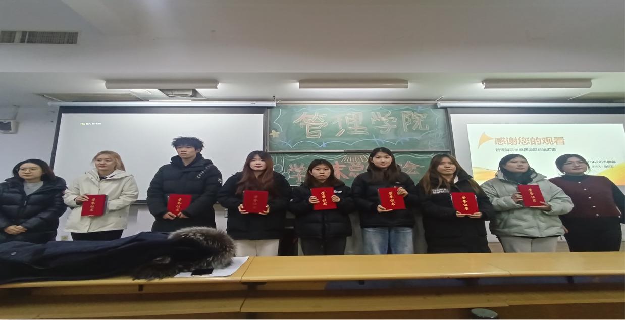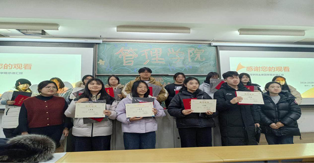 為表彰優秀,激勵先進,主持人宣讀了2024-2025學年第一學期管理學院優秀學生干部、優秀志愿者以及職業規劃大賽獲獎同學的名單,并由輔導員朱老師、劉老師為獲獎同學頒發證書和禮品。