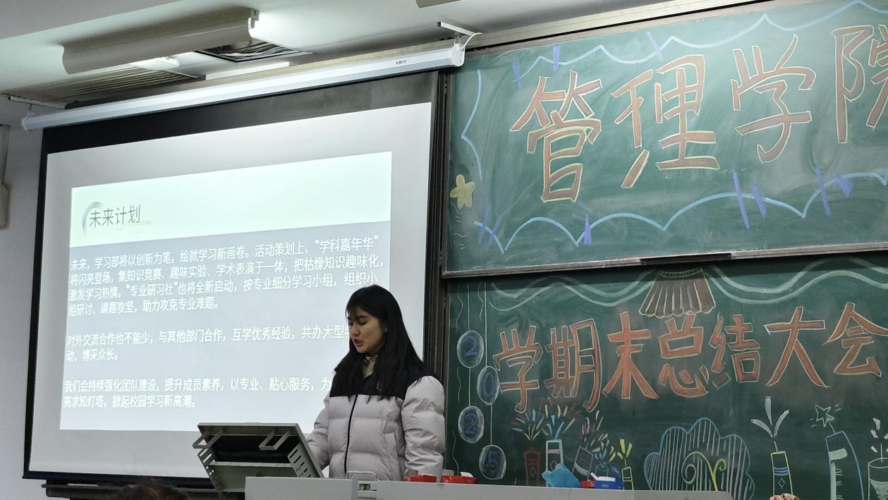 學習部部長韓欣妍進行了精彩發言。這學期,學習部成功組織了學科知識競賽與職業規劃大賽院級選拔賽,激發了同學們的學習熱情,參與人數眾多,效果顯著。面對存在的不足,如活動宣傳力度有待加強等,部長也提出了針對性改進措施。展望未來,學習部將繼續秉持服務同學的理念,為管理學院營造更濃厚的學習氛圍而不懈努力。