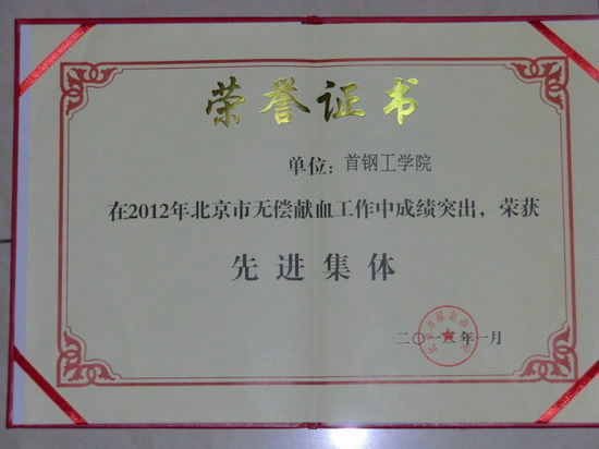 首鋼工學(xué)院被評(píng)為2012年北京市無償獻(xiàn)血先進(jìn)集體,6名教職工被評(píng)為北京市無償獻(xiàn)血先進(jìn)個(gè)人,6名教職工被評(píng)為石景山區(qū)無償獻(xiàn)血先進(jìn)個(gè)人。