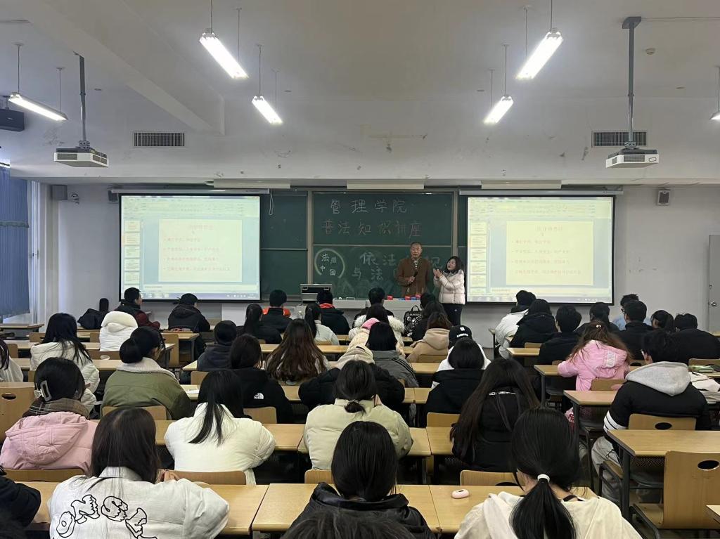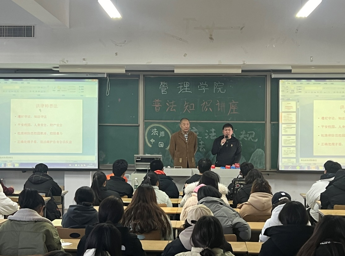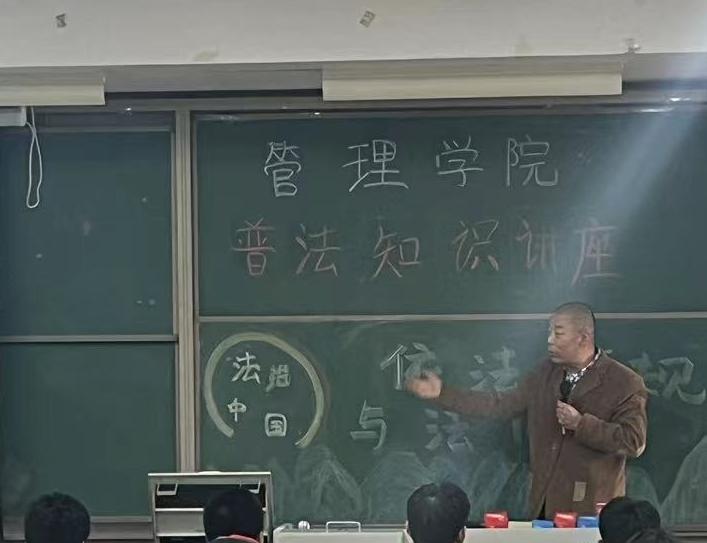 為深入貫徹落實黨的二十大精神,加強平安校園、和諧校園建設(shè),增強學(xué)生法律意識,提高自我保護能力,促進學(xué)生健康成長,預(yù)防違法犯罪行為。2024年1月10日管理學(xué)院邀請兩院法律顧問、法制輔導(dǎo)員、北京市華夏律師事務(wù)所的洪立新律師來為學(xué)生召開法制專題講座。