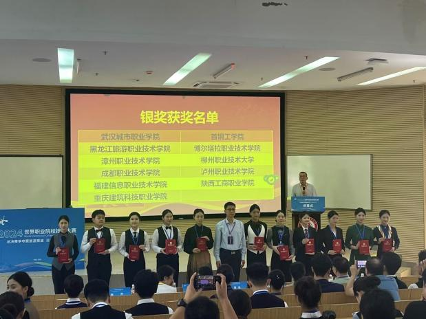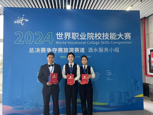 10月27日至30日,2024年世界職業(yè)院校技能大賽總決賽爭奪賽(高職組)旅游服務(wù)賽道酒水服務(wù)(賽項)在深圳職業(yè)技術(shù)大學隆重舉行,來自全國各地的57所職業(yè)院校的參賽隊伍共同競技。經(jīng)過兩天的激烈角逐,由我校管理學院旅游管理專業(yè)楊靜、梁蘇瑩兩位教師指導的楊琳、孫璐璇、宋弘政三位同學組成的代表隊憑借著扎實嫻熟的專業(yè)技能和頑強拼搏的團隊精神榮獲大賽銀獎,實現(xiàn)我校在本賽項國賽成績上的突破。