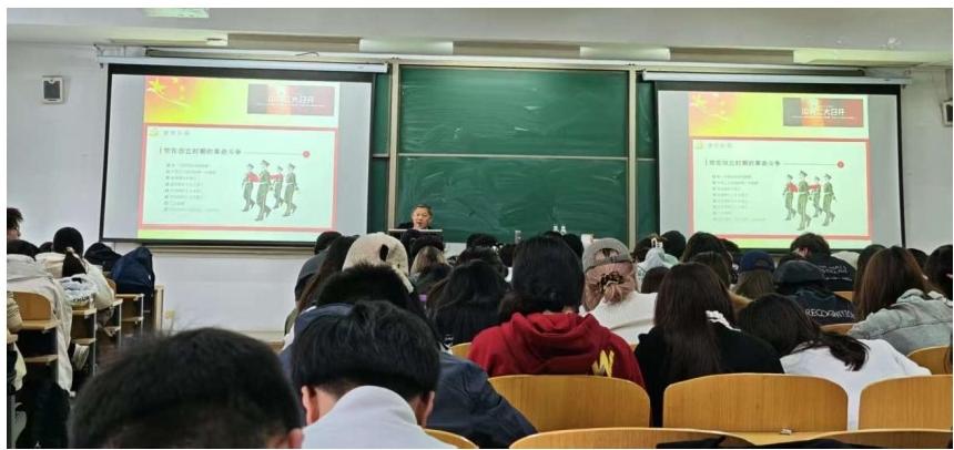 隨后,圍繞“牢記黨的奮斗征程”,趙教授帶同學們回顧了中國共產黨從成立到現在的光輝歷程。從艱苦卓絕的革 命戰爭年代、到波瀾壯闊的改革開放新時期、再到中國特色 社會主義進入新時代,黨的奮斗歷程如同一幅壯麗的畫卷在 學生們面前徐徐展開。趙教授用生動的語言和感人的故事, 讓學生們感受到了革命先輩們的英勇無畏和崇高精神,激勵 學生們珍惜來之不易的幸福生活,傳承紅色基因,接續奮斗。