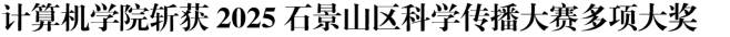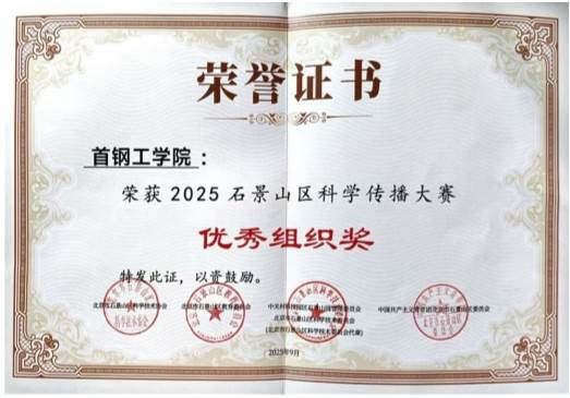 活動對 2025 石景山區科學傳播大賽一等獎及優秀組織獎獲得者進行了頒獎。在此次大賽中,首鋼工學院師生積極參與、踴躍投稿,憑借扎實的科學素養與創新的傳播形式,斬獲多項重要獎項。其中,