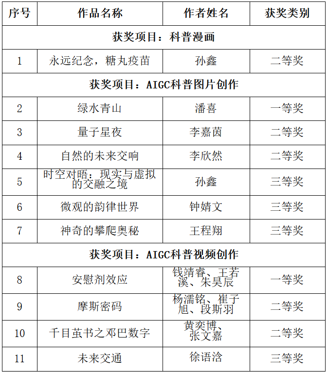 4 名學生憑借精彩的科普作品榮獲一等獎,另有多名師生分獲二、三等獎,涵蓋科普漫畫、科普圖片、科普視頻等多個類別。參賽作品圍繞“科技改變生活,創新贏得未來”主題,充分體現了我校師生的科學思維與創新能力。同時,我校被授予“優秀組織獎”,這一榮譽是