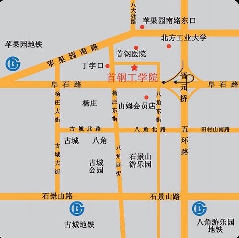 五、自駕車到達首鋼工學院路線:市區自駕車可沿阜石路向西,過晉元橋下橋后路北即是首鋼工學院南門;郊區自駕車可到 西五環,自阜石路(石景山、門頭溝方向)出口下路即是首鋼工學院南門。